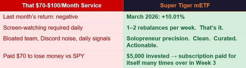 This newsletter is produced for educational and informational purposes only. It does not constitute financial advice. All investing involves risk. Past performance of any strategy or indicator does not guarantee future results. The Super Tiger mETF is a proprietary personal portfolio — not a registered fund. Always conduct your own due diligence and consult a qualified financial advisor before making investment decisions. Individual stock and portfolio returns cited are from personal trading accounts tracked via Composer.trade.