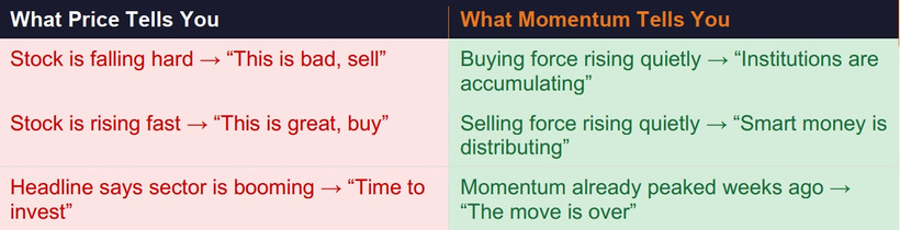 Of all the signals in the scorecard, the most powerful — and the most misunderstood by retail investors — is what professional traders call the Buying/Selling Momentum indicator. Understanding this principle is the key to understanding why the Super Tiger methodology consistently sees moves before they become obvious.