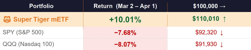 While the S&P 500 shed −7.7% and the Nasdaq fell −8.1%, the Super Tiger mETF delivered +10.01% — a gap of nearly 20 percentage points, built in one of the ugliest macro months in recent memory.