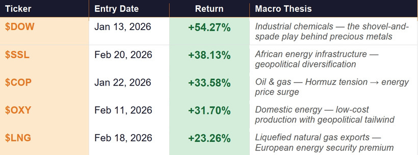 Before we explain how the methodology works, let’s look at what it produced. Every position below was entered months before March — while most investors either hadn’t noticed the setup or were still waiting for “confirmation.”